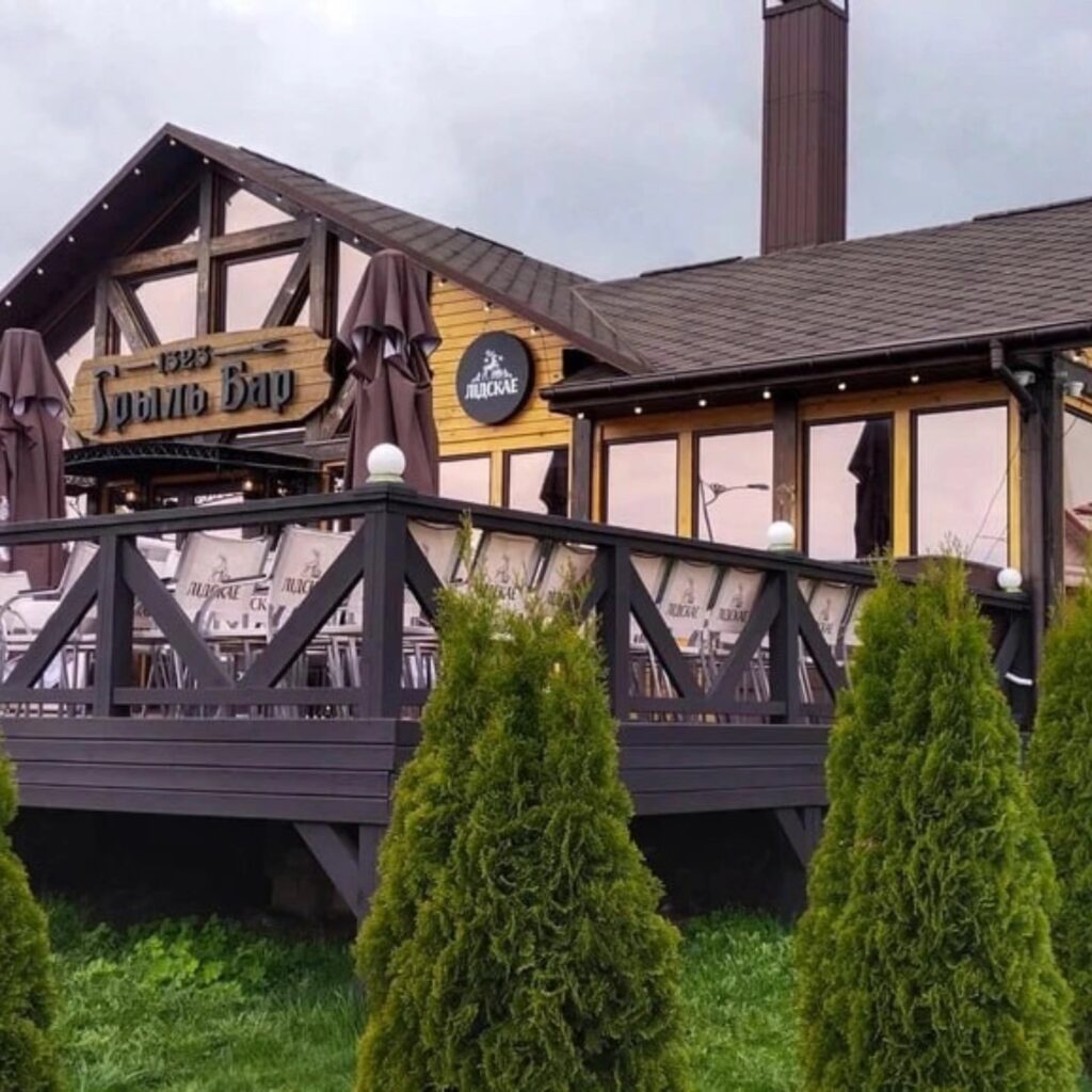 Объект общественного питания гриль-бар «1323» (г. Лида, ул. Замковая, 7) – цветовые опознавательные знаки (контрастная маркировка, тактильные элементы), наличие пандуса с поручнями, рядом находится автостоянка и парковка для автобусов.