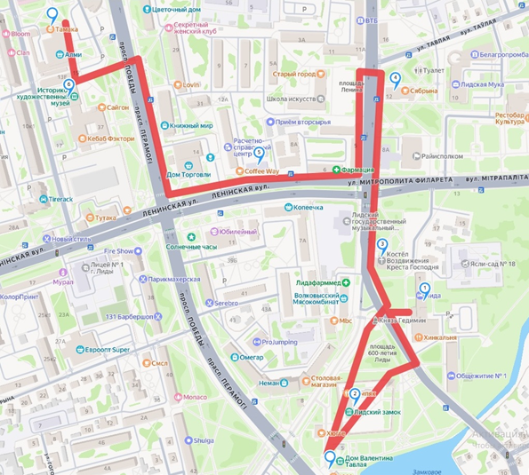 Маршрут экскурсии: гостиница «Лида» – Лидский замок – Костел Воздвижения Святого Креста – Отдел ремесел и традиционной культуры – Лидская районная библиотека им. Янки Купалы – Лидский историко-художественный музей – место окончания экскурсии.